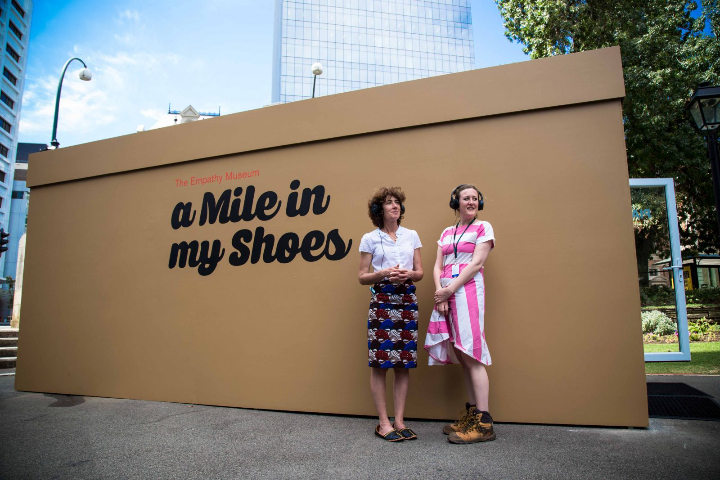 Az egy mérföld a cipőmben nevezetű kiállítás igazából egy cipőbolt, ahol a vendégek valaki másnak a cipőjében sétálhatnak (és tényleg egy óriási cipős dobozban van a kiindulópontja a kiállításnak). A széles cipő kollekció hanganyaggal párosul, amikben felfedezhetik a látogatók a mindannyiunkban lévő emberséget. A szíriai menekülttől kedve a veteránon, idegsebészen keresztül a szexmunkásig mindenkivel találkozhatunk itt. A történetek is pont olyan változatosak, mint az emberek. Az élet különböző meghatározó eseményeiről hallhatnak az emberek: veszteségről, gyászról, de reményről és szerelemről is. Nem csak fizikai, de lelki útra is kelnek a kiállítás látogatói.