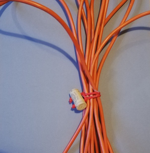 Kábelköteg-összefogó, borosüveg dugójából és ajándékszatyor leszakadt füléből