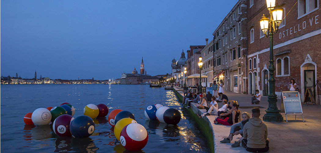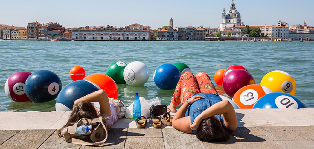 A hajózási bójákból átalakított színes biliárdgolyók július 6-ig ringatóztak a Giudecca sziget előterében, a velencei lagúna vizén, de azt már a zárás után azonnal elmondhatjuk, hogy nagy siker volt: képei a szó szoros értelmében körbejárták a világot, a kínai és koreai megosztások után legutóbb éppen brazil és argentin site-okon találkozhattunk vele.