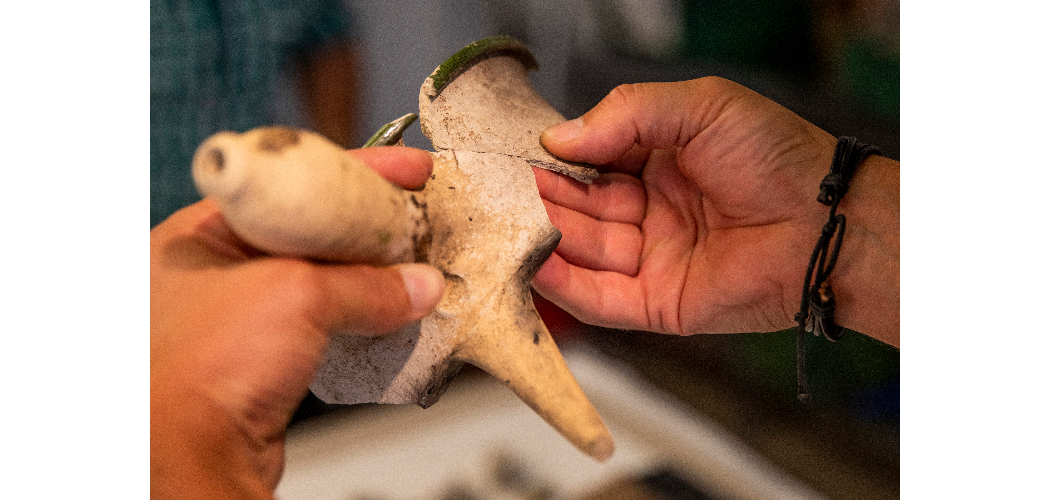 Csányi Viktor régész egy török kori fazék cserépdarabjait illeszti össze a Tornyai János Múzeumban