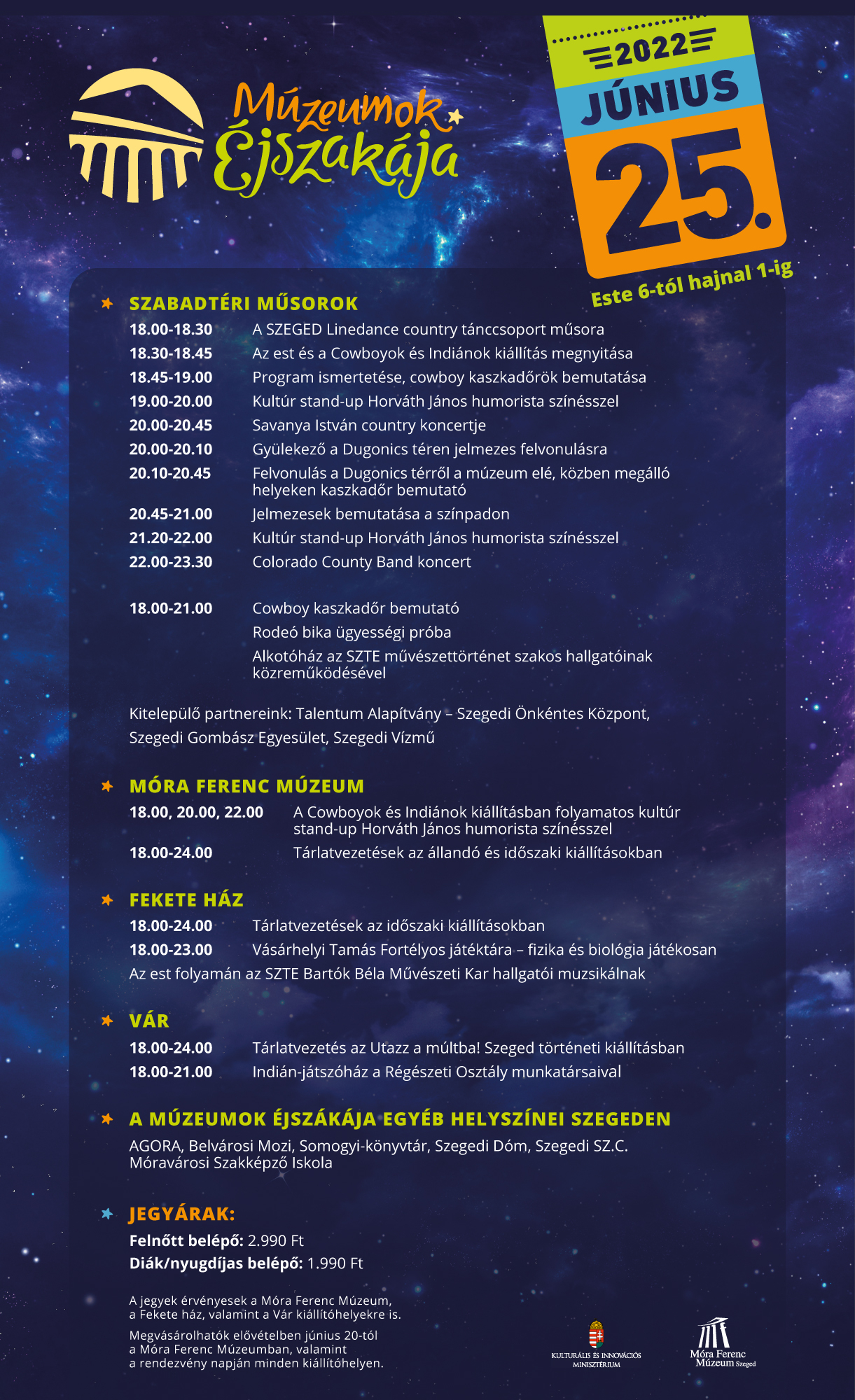 Különleges Múzeumok Éjszakája várja az érdeklődőket Szegeden: június 25-én, szombaton nyitják meg a Móra Ferenc Múzeum cowboy és indián kiállítását. Az estére igazi vadnyugati hangulattal készülnek: a múzeum előtti színpadon country táncelőadást láthat és country koncerteket hallhat a nagyközönség, valamint egy rodeóbikát is kipróbálhat.