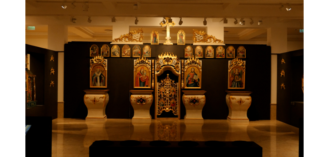 A kiállítás központi elemét a Néprajzi Múzeum és a Görögkatolikus Metropólia közti több éves közös munka eredményeként a Néprajzi Múzeum tulajdonában lévő, Magyarkomjátról (Velyki Komiaty) származó ikonosztáz meghatározó darabjai alkotják. Az ikonosztáz a barokk és a bizánci örökséget őrző keleti rítusú világ egymásra hatását szemlélteti. Az egykor Ugocsa vármegyéhez tartozó Magyarkomját görögkatolikus parókiája 1913-ban a budapesti Iparművészeti Múzeumnak adta el ikonosztázionját, melyet az 1960-as években a Néprajzi Múzeumnak adtak át. Az ikonosztázion eredettörténetét, szétszóródott darabjait 2006-ra sikerült feldolgozni, illetve azonosítani. Az ikonosztázion teljes képanyagának restaurálása 2018-19-ben történt meg. A 18. század végéről származó ikonosztázt közel húsz festő és farestaurátor keltette életre, két éven át tartó színvonalas szakmai munkával, melynek eredményét most a nagyközönség is megcsodálhatja.