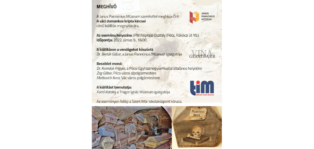 A kiállítás megnyitója június 9-én 16 órakor lesz a JPM Néprajzi Osztályán (Pécs, Rákóczi út 15.). Az eseményen beszédet mond Zag Gábor, Pécs alpolgármestere, valamint dr. Kvanduk Frigyes, a Pécsi Egyházmegyei Hivatal általános helynöke, illetve Matkovich Ilona, Vác polgármestere és Forró Katalin, a váci Tragor Ignác Múzeum igazgatója. A tárlat 2022. december 31-éig tekinthető meg nyitvatartási időben (keddtől szombatig, 10 és 16 óra között).