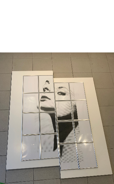 A kiállítás plakátján egy pop art stílusban szerkesztett, fekete-fehér női arc portréja szerepel, amely akár filmplakátnak is funkcionálna. A kiállítótérben egész más szerepben láthatjuk a plakát-fotót, a fénykép tizenhat négyzetre van lebontva, a négyzet alakú csempére fektetve. A fotó és a csempe geometriai alakzatainak tudatos, de nem tökéletes összeillesztése a fényképen megjelenő határozott, de szeszélyes érzelmeket vetíti vissza, így az installáció egész más hatást gyakorol, mintha csak a fehér falon lógna.