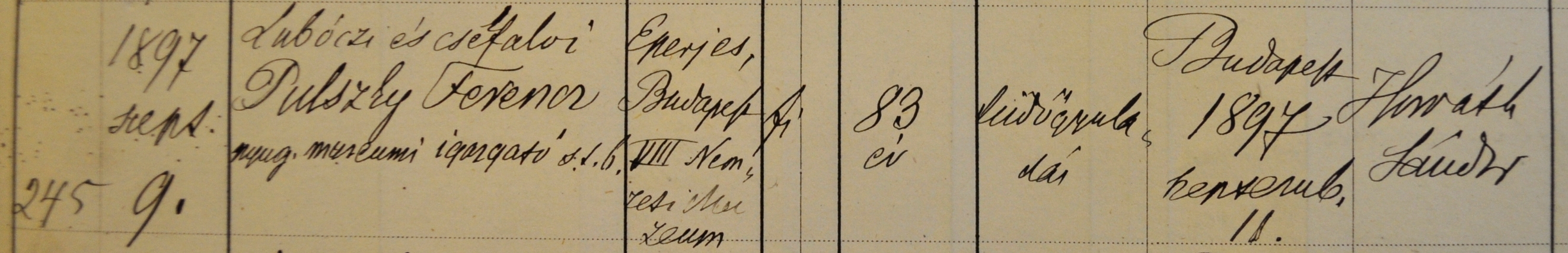 Pulszky halotti anyakönyvi bejegyzése (Deák téri Evangélikus Lelkészi Hivatal)