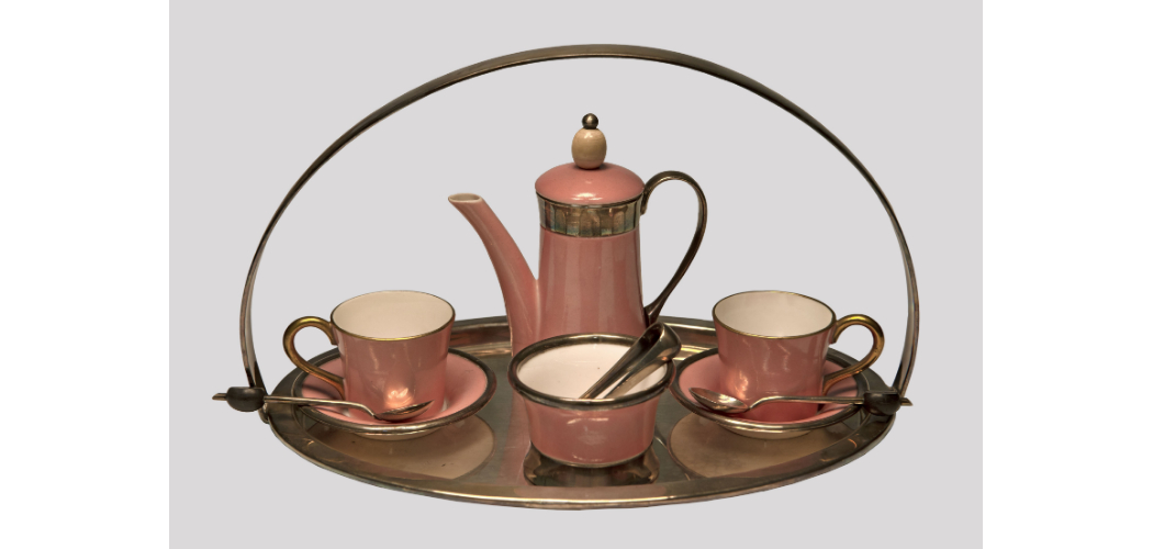 Rózsaszín álom - így jellemezte Kiss Nóra néprajzkutató azt a bájos, 20. század eleji kávéskészletet, ami néhány éve került a múzeum gyűjteményébe. A kétszemélyes készlet apró csészéibe legfeljebb egy kis adag kávé, mondjuk ristrettoférhetett. Az alpakka tálcán egy rózsaszín-fehér mázas kis fedeles kancsó, két csésze és cukortartó fért el csipesszel és két kiskanállal, melynek végén a kávébabot imitáló bakelit díszítés fokozta a kávézás élményét.