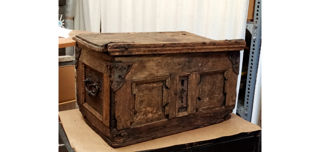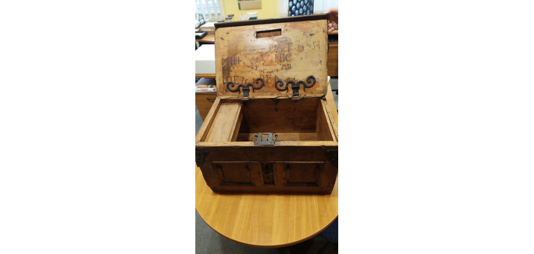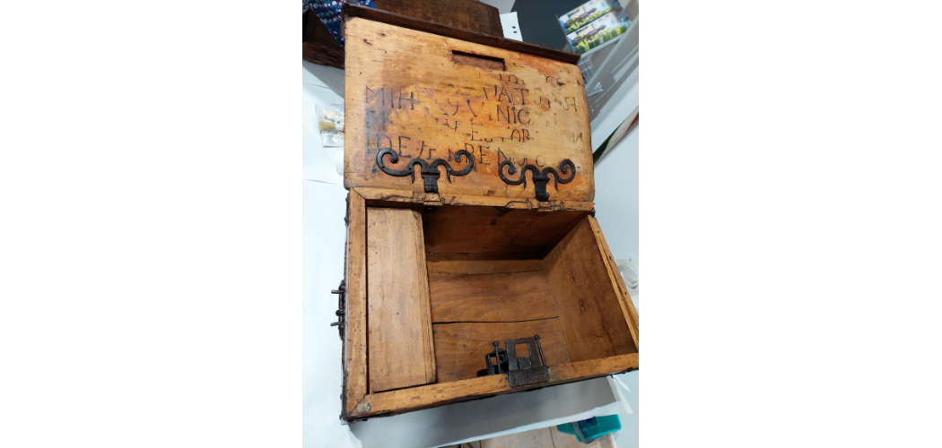A korábbi és kisebb céhláda belső oldalán részben hiányos festett feliratok vannak, amelyre valamely utód feltehetően a 20. században ráírta, hogy a láda 1626-ból való. A restaurálás alkalmával megtisztításra kerültek a céhes láda fém veretei is. A fa részeit valamint a festett részeket konzerválták és néhány hiányos fa oldaldíszítést pótoltak. A restaurálás során megállapítható volt, hogy egykor kívülről is valamint a fém zárócsatoknál és díszítéseknél belül is textilborítás, amelynek néhány darabja még most is megtalálható a csat alatt részben rejtve. Ez egy fontos megállapítás volt a tárgy eredete és történeti megfejtése, beazonosítása kapcsán. A céhláda jobb fa oldala felülről eltávolítható, felhúzható azért, mert alul egy alsó elkülönített rekesz van. Ez szintén fontos megállapítás, hiszen az alsó részben elkülönítetten tároltak tárgyakat, dokumentumokat. Mind a láda kinézete, stílusa, veretei illetve a felirat írásmódja megerősíti azt, hogy a láda a 17. század első éveiből való. Stílusjegyei alapján egyértelmű, hogy céhládáról van szó.