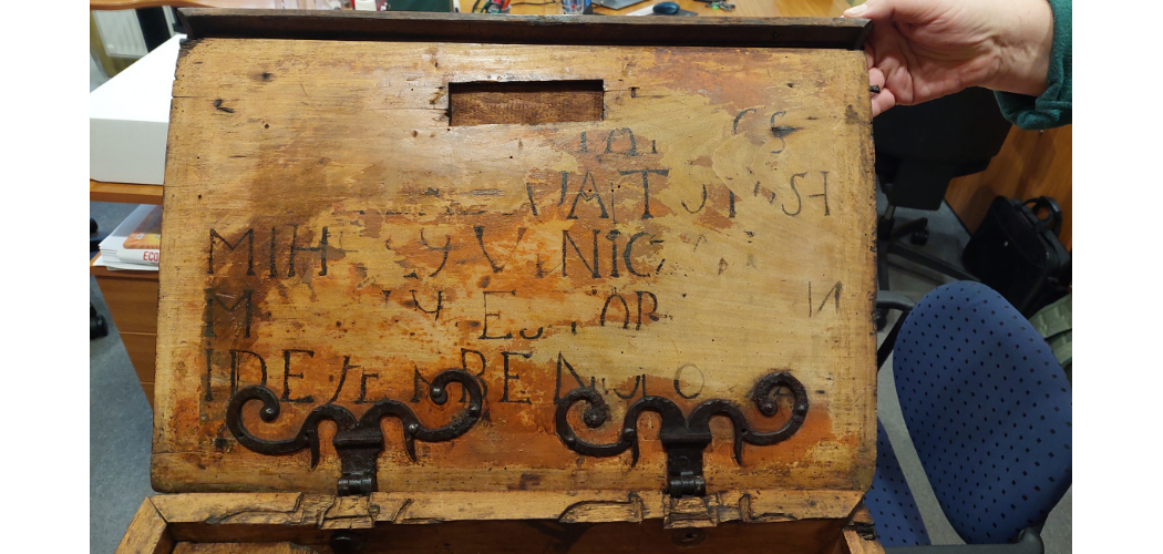 A kutatás megállapította, hogy nem latin, hanem magyar nyelvű felirat található a ládán, de a latin sh – ae korban használatos betűket is kombinálva használják a láda belső festett feliratain. Az erősen hiányos és kopott feliratot a restaurátorok betűjavításának megerősítésével lehetett csak megfejteni. Látszik, hogy valakik feltehetően nem megfelelő tisztítás során eltávolították a felirat egy részét. A céhláda története azonban addig rejtve maradt, mígnem megpróbálta dr. Török Róbert muzeológus az analógiák alapján megfejteni a hiányos belső leírást. Ehhez az Országos Széchényi Könyvtár kézirattárában (Fol. Hung. 2392.) lévő céhes megerősítő privilégiumlevél segített: Nagyvázsony mezőváros takács mesterei gróf Zichy Imre (1669-1746) kérésüket támogató levelével együtt, Pozsony város polgármesteréhez fordultak (1692-ben), hogy a Pozsonyban működő takács céh levelének másolatát adná ki számukra. A királyi város tanácsa 1552-ben az I-XX. pontból álló privilégiumot megújította 1579-ben, amelynek másolatát kapták a vázsonyi takácsok, mint filiális mesterek 1692. június 30-án. Végül a megrongálódott régi céhlevelet Nagyvázsony város jegyzője renováltatta 1741. május 11-én és azt megerősítette pecsétjével. A királyi privilégiumot Mária Teréziától kaptak 1769-ben. A nemzeti könyvtárban őrzött céhes iratot Domonkos Ottó (1928-2022) történész publikálta 1998-ban A magyarországi takácsok mintakönyvei című munkájában.