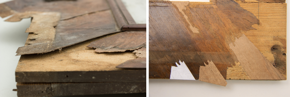 jobbra: A törésfelülethez illeszkedő furnérkiegészítések elkészítésének egyes fázisai