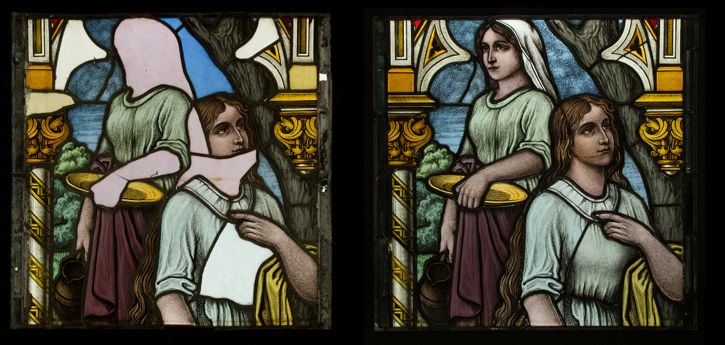 Szeretnék párhuzamot vonni egy diplomamunkaként restaurált üvegablak bemutatásával, érzékeltetve a hozzáállásbeli különbséget. Azt le kell szögezni, hogy a restaurátoretika egyik legkényesebb pontja éppen az arcábrázolás. A korábban ismertetett előkészítő munka részeként a hallgató az üvegablak készítőjének teljes életművét tanulmányozva, a templom többi üvegablakán megtalálható festéstechnika mélyreható elemzésével alapozta meg a hiányzó arc rekonstruálásának lehetőségét, majd modellkísérletek sorozata után készítette el (7. kép).