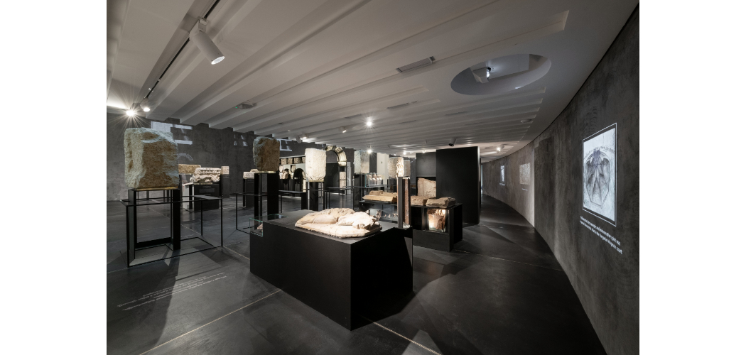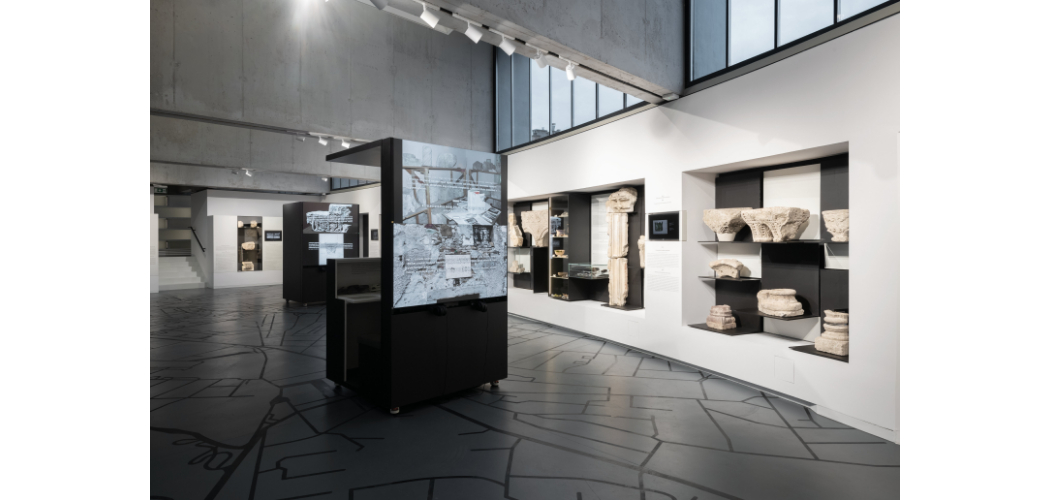 A kiállítótérbe a 12. századi átépítés során kialakított főkaput megidéző installáción át juthatunk be (ld. a boítóképen). A kapuból ugyan csak 20 kő maradt fenn, de az eredeti méreteket idéző kortárs kialakítású fém vázszerkezetbe helyezve őket képet kapunk a bazilika hajdan volt dimenziójáról.