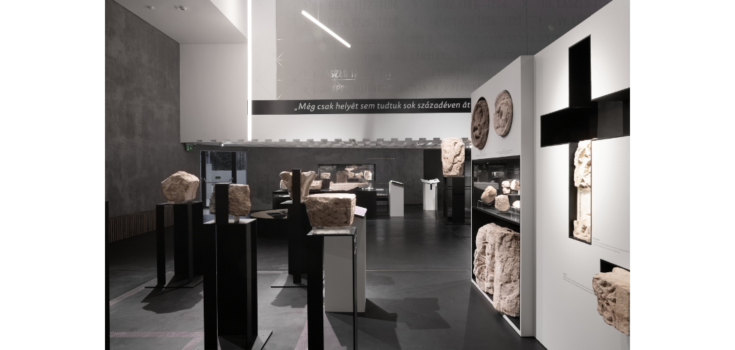 A gótikus átépítések kövei kerültek ki az első emeleti falakra akasztott polcokra, a ráépítések sorrendjének bemutatásával. Itt valós magassági méretek érzékeltetésére nem volt lehetőség, ezért a kövek mellé rendelt monitorokon futó digitális installációk, szimulációk és összeépíthető makettek segítik a befogadást. Hasonlóan alakult a második emeleti, a kutatástörténetet befogadó tér az ívelt fal mentén felsorakoztatott kövekkel, monitorokkal, melyet – konferencia esetén a térben átrendezhető, elgördíthető– beülő foglalkoztató dobozok egészítenek ki.