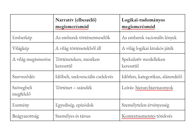 A narratív paradigma elterjedése nagy szerepet játszott a tudományos módszertani gyakorlatok változásában. Ez a fogalom Walter Fisher (1931-2018) nevéhez köthető, aki az 1980-as években dolgozta ki és fogalmazta meg elméletét: az emberek alapvetően történetmondók, az egyének a környezetüket narratív módon közelítik meg, narratív keretrendszerben cselekednek és hoznak döntéseket (lásd 1. ábra). Fisher népszerűsítette a Homo narrans elnevezést is, amely arra utal, hogy a történetmesélés alapvetően meghatározza emberi létünket. Az olvasónak talán ismerős lehet Johan Huizinga elmélete, a Homo ludens (ez az 1938-ban megjelent könyve címe is) – szerinte az emberi kultúra meghatározó eleme a játék.