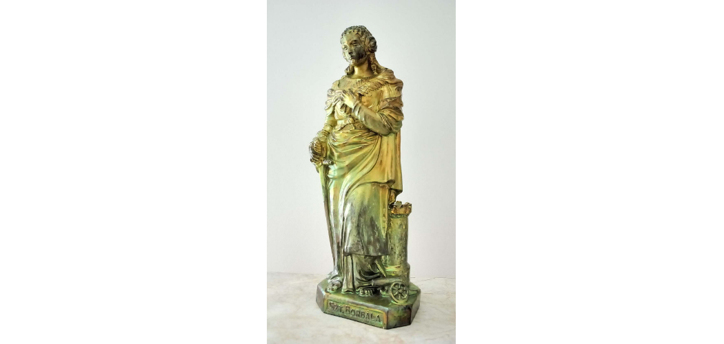 szabadtéren található a fából, kocsányos tölgyből faragott szobor, ami Szabó Tibor munkája. Ezenkívül van egy festett, lakkozott fatalapzaton álló, 65 centiméter magas gipszszobor, az alkotó Vörös János szobrászművész. Büszkék vagyunk a Zsolnay-különlegességünkre: a Tüzér Szent Borbála eozinmázas pirogránit szobor, teljes magassága 71 cm. Ezt Sikorszky Zsolnay Lívia (Piacsek Emilné) szobrászművész 1931-ben készítette. Egyike azoknak a szobroknak, melyeket a pécsi és a hajmáskéri tüzérségi alakulatok megrendelésére készített a pécsi Zsolnay-gyár. A szobron megjelenik az ágyú, a kard, a torony és a pálmaág. Ezenkívül festmények, kisplasztikák láthatók gyűjteményünkben. Advent első vasárnapján ugyancsak egy porcelánt tettünk közzé, amit Magyar Borbálának neveznek. A festett herendi porcelán 32 centiméter magas, Christian Jorhan bajor mester színes faszobrának mintájára tervezte Benke István és Jármai Ervin. Arra buzdítom az olvasókat, hogy nézzék hetente a múzeum közösségi oldalát és fedezzék fel ezeket az ábrázolásokat.