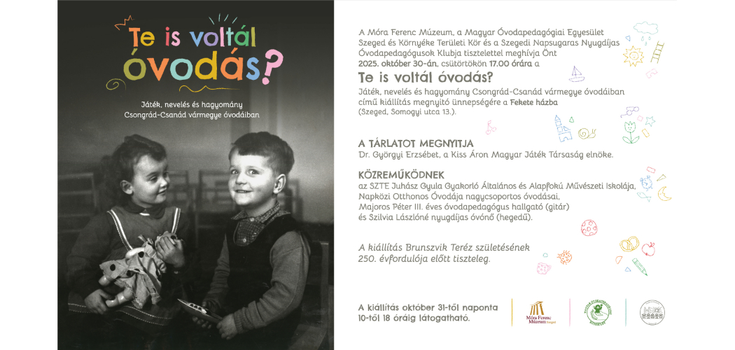 Új időszaki tárlattal várja az érdeklődőket a Fekete ház: október 30-án nyitják meg a „Te is voltál óvodás? Játék, nevelés és hagyomány Csongrád-Csanád vármegye óvodáiban” című kiállítást Szegeden. A tárlaton főként az 1950-1980-as évek közötti tárgyakkal szemléltetik az óvodák fejlődését, átalakulását.