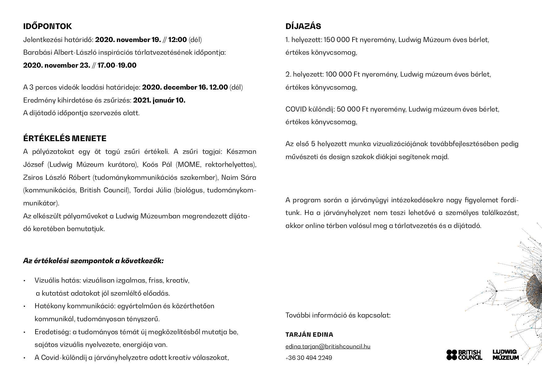 A Ludwig Múzeum és a British Council felhívást hirdet egyetemistáknak kutatási témájuk vizuális és szemléletes bemutatására. Ha érdekel a tudomány, a vizualitás és a művészet találkozása, akkor ez a te kihívásod! A program a BarabásiLab: Rejtett mintázatok című kiállításhoz kapcsolódik, és a jelentkezők a Múzeum újra nyitása után Barabási Albert-László tárlatvezetésén is részt vehetnek.