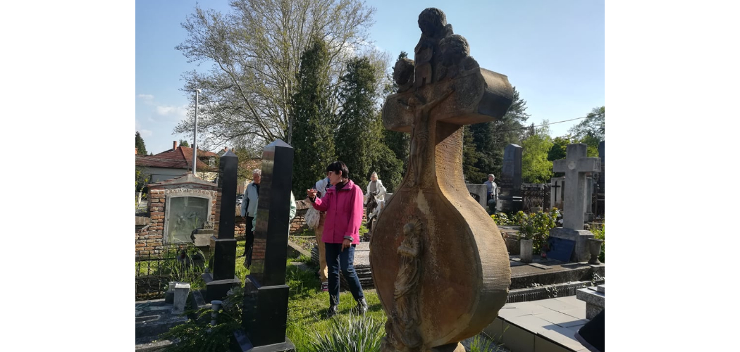 A temetőkertben Both István önkéntes temetőgondnok fogadta a vendégeket, akitől megtudtuk, hogy az 1700-as évekből származnak az első sírok, igaz, a fejfákat annak idején tölgyfából készítették, így azok már nem maradtak fenn. Megyeri Anna egy különleges lant alakú sírkőre is felhívta a figyelmet, az ugyanis Gothard János csizmadiamester és felesége, Simonfy Borbála emlékhelye, akiknek egy értékes műemléket köszönhetünk mi zalaegerszegiek. Ők a belvárosban, a Várkörön éltek takaros házukban, és mivel mélyen vallásos emberek voltak, a jótékonykodást is fontosnak érezték. Ők állíttatták azt az emblematikus alkotást, amely mellett oly sokszor elhaladunk, ez pedig a Szentháromság-szobor a Mária Magdolna Plébániatemplom előtt. A szemfülesek észrevették már, hogy valamennyi szent elegáns csizmát visel. Bizony, ez sem véletlen, hiszen Gothárd Jánosnak köszönhetően a csizmadiacéh ajándéka volt ez az impozáns szobor a város lakóinak. Ahogy az is érdekes adalék volt, hogy a temető területe koponya alakú dombon fekszik, és kelet-nyugati tájolású. Kezdetben fakerítés ölelte körül a sírkertet, ma már stációkkal körbevett kőkerítés díszíti.