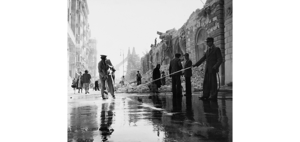 [Söprögető, a Bristol Szálló sapkáját viselő férfiak a romos Dunakorzón, Budapest], 1948, Robert Capa, Courtesy International Center of Photography