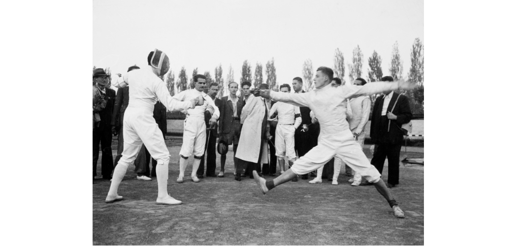 [Vívók és közönségük, közöttük (a fejvédjét tartó) Berczelly Tibor olimpiai bajnok kardvívó egy sportbemutatón, Budapest], 1948. szeptember, Robert Capa, Courtesy International Center of Photography