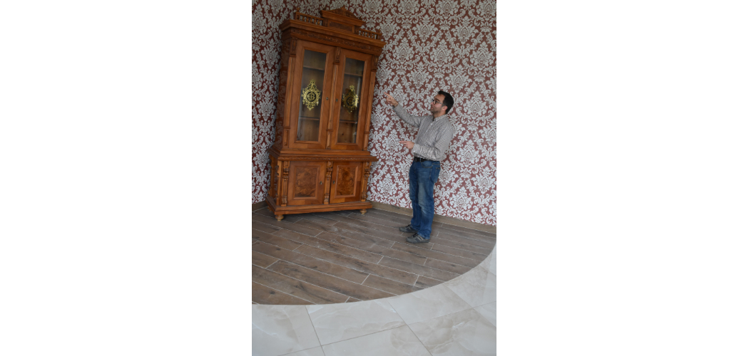 Nagy István főmuzeológus a a kiállítótér szalonjában munka közben
