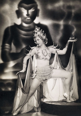 Ahogyan az a kiállítás festmény- és fotóanyagában is látható, a táncnak és az erotikának a keleti vallásokkal való összevegyítése a korszak kedvelt motívumává vált, s ez alól a legnépszerűbb és legdinamikusabban fejlődő művészeti ág, a film sem vonhatta ki magát. A negyvenes évek elején készült el a hírhedt Mata Harira emlékeztető, a keleti táncosnő figuráját középpontba helyező két film, a Sziámi macska és a Machita, melyek lakásbelsőihez a Hopp Ferenc Múzeum főként japán és kínai műtárgyanyagát vették kölcsön. A két film főszerepét játszó Szeleczky Zita, illetve Karády Katalin keleti táncot lejtő alakja feltűnik a kiállításon bemutatott filmrészleteken, csakúgy, mint a környezetükben díszletként alkalmazott keleti tárgyak.