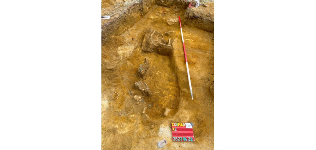 A Csomád község határában található új lelőhelyet Tóth Béla, a Közösségi Régészeti Egyesület és a Ferenczy Múzeumi Centrum (FMC) közösségi régészeti programjának helyi civil önkéntese fedezte fel. A helyszín régészeti szempontból fokozottan veszélyeztetett, részben a mezőgazdasági munkálatok (szántás), részben a területen rendszeresen folyó szabálytalan fémkeresőzés miatt, így a mielőbbi leletmentő feltárás mellett döntöttek a régészek és az Egyesület önkéntesei. Az ásatás két szakmai vezetője Dr. Rácz Tibor Ákos, a Ferenczy Múzeumi Centrum régésze, egyben a Közösségi Régészeti Egyesület elnöke, valamint Füredi Ágnes, a Magyar Nemzeti Múzeum Nemzeti Régészeti Intézetének régésze volt. A hatékony és gyors munkát a Pázmány Péter Katolikus Egyetem Régészettudományi Intézetének hallgatói és az Egyesület önkéntesei segítették. A célzott kutatás során egy honfoglalás kori, valamikor a 10. század derekán elhunyt férfi sírját sikerült megmenteni a végső pusztulástól. A korábbi szántás által részben széttúrt, töredékes sír ún. részleges lovas temetkezés volt, íjászfelszereléssel. A bolygatás ellenére egyes leletek olyan állapotban maradtak meg, hogy eredeti (ún. in situ) helyzetben, a környező talajjal együtt felszedve azokat, lehetőség nyílt jól felszerelt restaurátorműhelyben elvégezni a pontosabb, szakszerű dokumentálást és azonnali konzerválást.