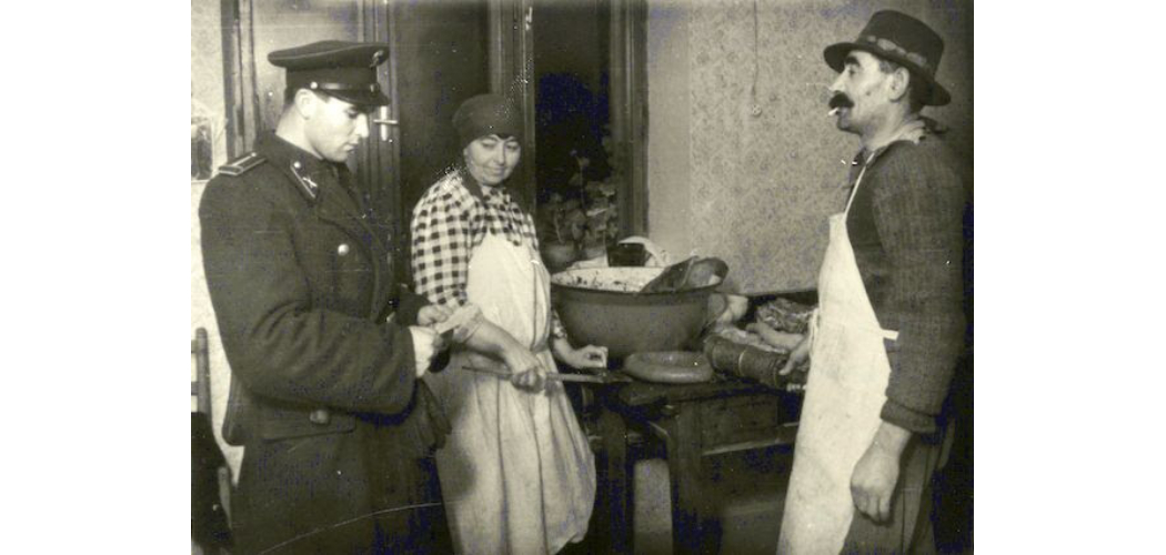 Rendőr ellenőrzi a disznóvágást. Pécs, 1952. január 11. Ruttkay Pál felvétele. (MNM Történeti Fényképtár)