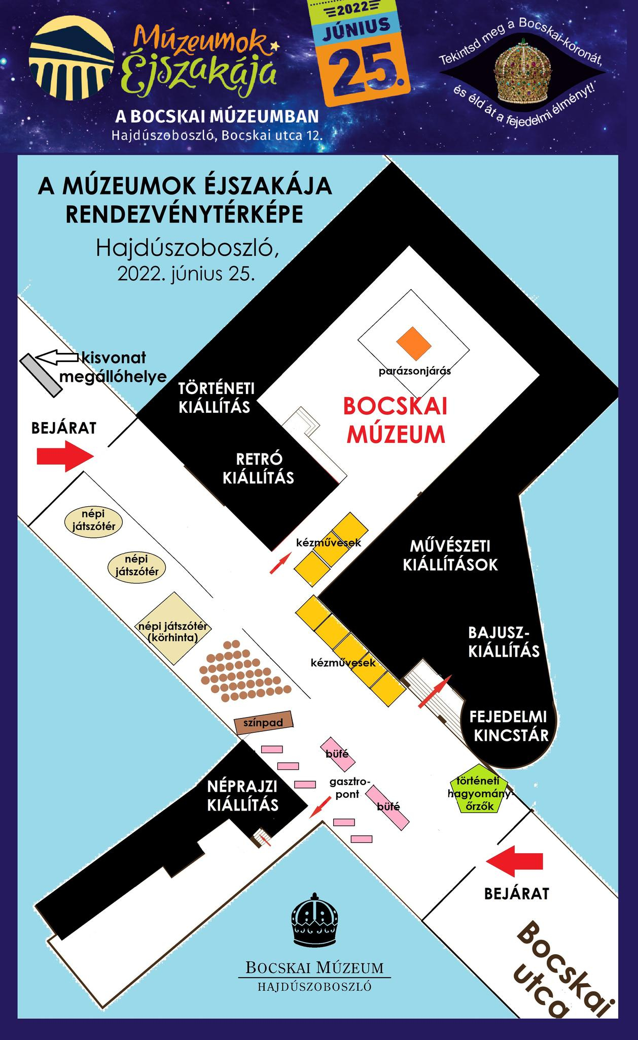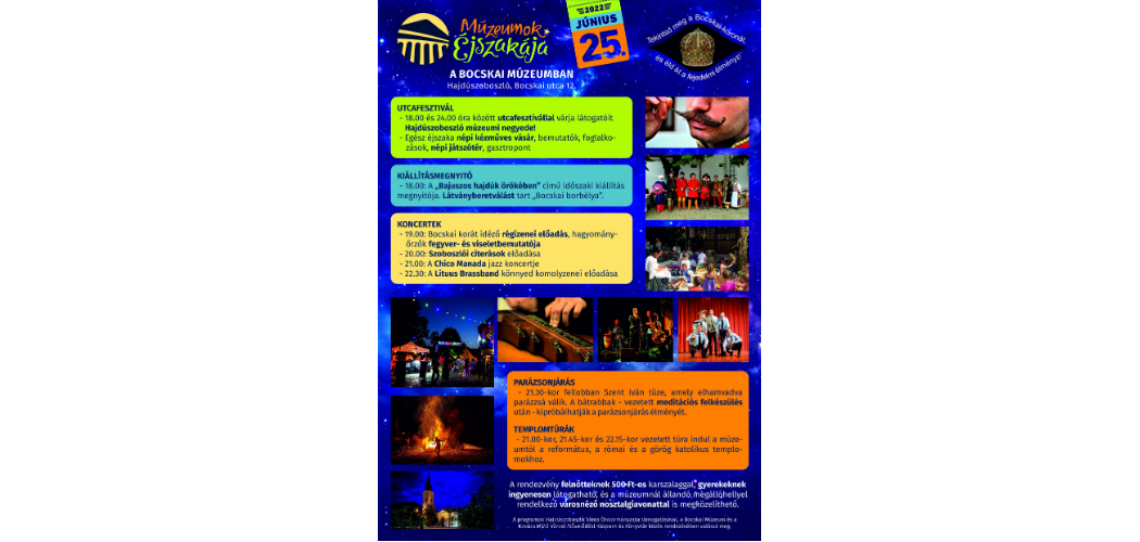 A múzeumok éjszakáján kalandos időutazásra hívja látogatóit Hajdúszoboszló múzeumi negyede. Június 25-én este hat órától éjfélig, idén először utcafesztiválon mulathatnak a résztvevők a Bocskai utcában! Lesz fegyver- és viseletbemutató, kézműves foglalkozások és vásár, népi játszótér, koncertek és templomtúrák! Megcsodálható továbbá a Bocskai korona- és jogarmásolat.