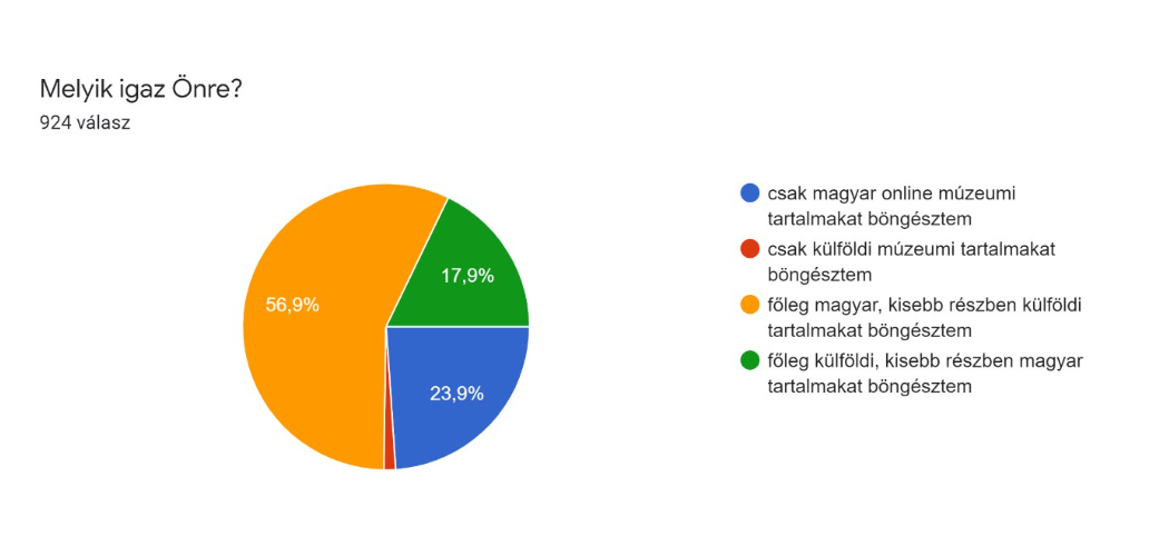 - - A megkérdezettek mindössze 23,9 százaléka böngészett kizárólag magyar múzeumi tartalmak között. A túlnyomó többség, 56,9 százalék inkább magyar, 17,9 százalék inkább külföldi anyagokra koncentrált, és tizenketten (1,3%) csak a nemzetközi színtéren szörföltek.