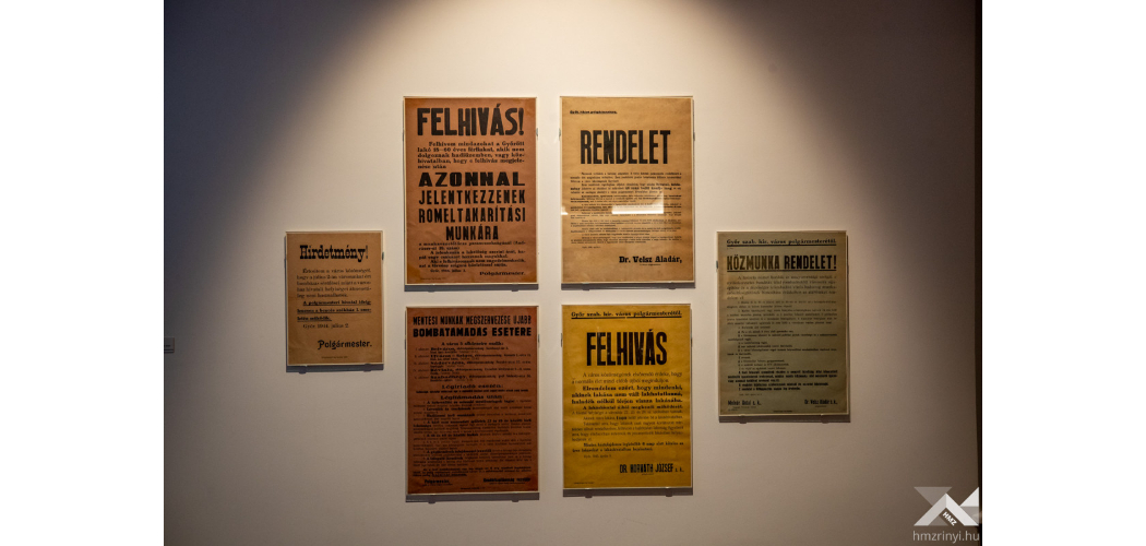 Az Esterházy-palotában megrendezett kiállítás a II. világháború előtti és alatti győri polgári élet bemutatásával indul. A falra vetített korabeli fotókon a város jellegzetes helyszínei, a régi Győr életképei villannak fel - személyessé vált történelem, megőrzött emlékezet kér időt tőlünk. Időt, hogy visszanézzünk, kérdezzünk, együttérezzünk. A győri gyáripar emlékei és a Messerschmitt repülők relikviái mellett egy benyíló falrészben korabeli mozitermet idéző díszletek között régi filmhíradók helyeznek minket a második világháború kulisszái közé, így szükségszerűen érintetté, egyszersmind sebezhetővé téve minket - mindkettő elengedhetetlen attitűd ezen a kiállításon.