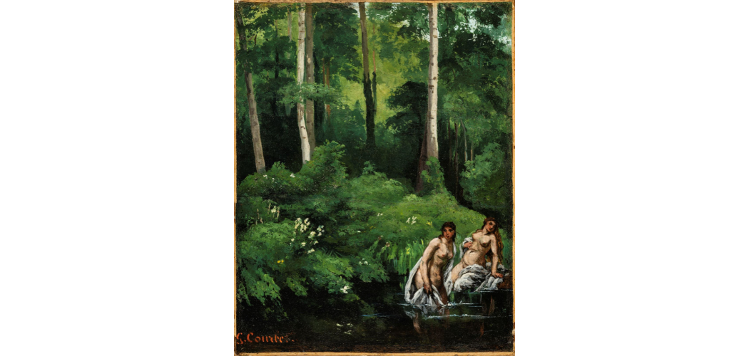 Az 1862-ben festett, 41 × 33 centiméteres vászonkép két félmeztelen nőt ábrázol, akik fürdőt vesznek az erdő mélyén. Courbet szívesen hódolt az akt műfajának – a festmény majdnem tíz évvel a polgárpukkasztó Fűrdőzők című képe után készült, melynek idealizálatlan női alakjai hatalmas botrányt kavartak az 1853-as párizsi Szalonon. Noha a festő ebben az esetben is ragaszkodott realista elveihez, a természethűséget érzékiséggel vegyítette: a hölgyek önfeledten mártóznak a vízben, csaknem kacéran tekintenek a néző irányába. Alakjuk kontrasztot képez az erdő erőteljes zöld tónusaival, a vizuális ellentétet Courbet technikája is felerősíti: míg a figurákat hagyományos módon ecsettel ábrázolta, a sokkal nyersebbnek ható tájat festőkéssel formálta meg.