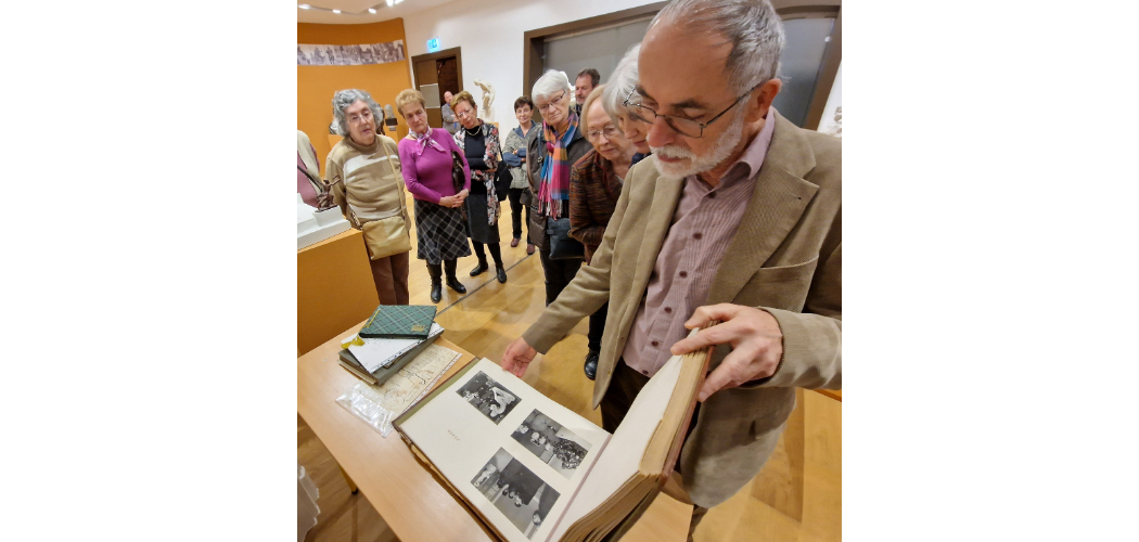 Dr. Kostyál László művészettörténész a hagyatékból származó fotográfiákat mutatja az érdeklődőknek