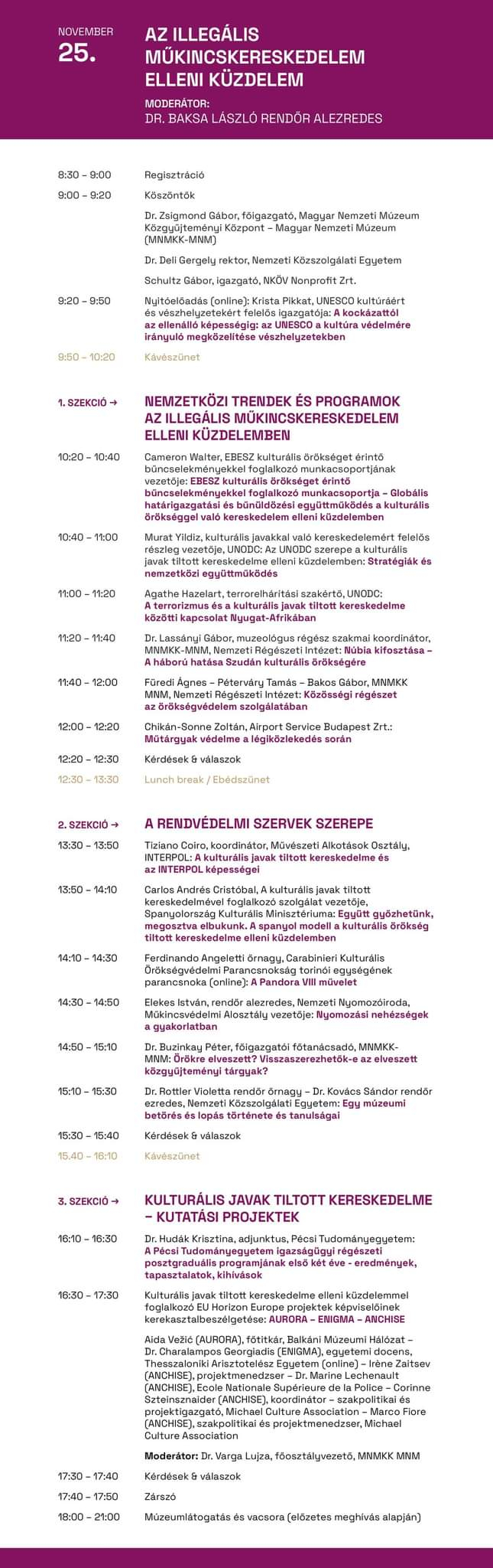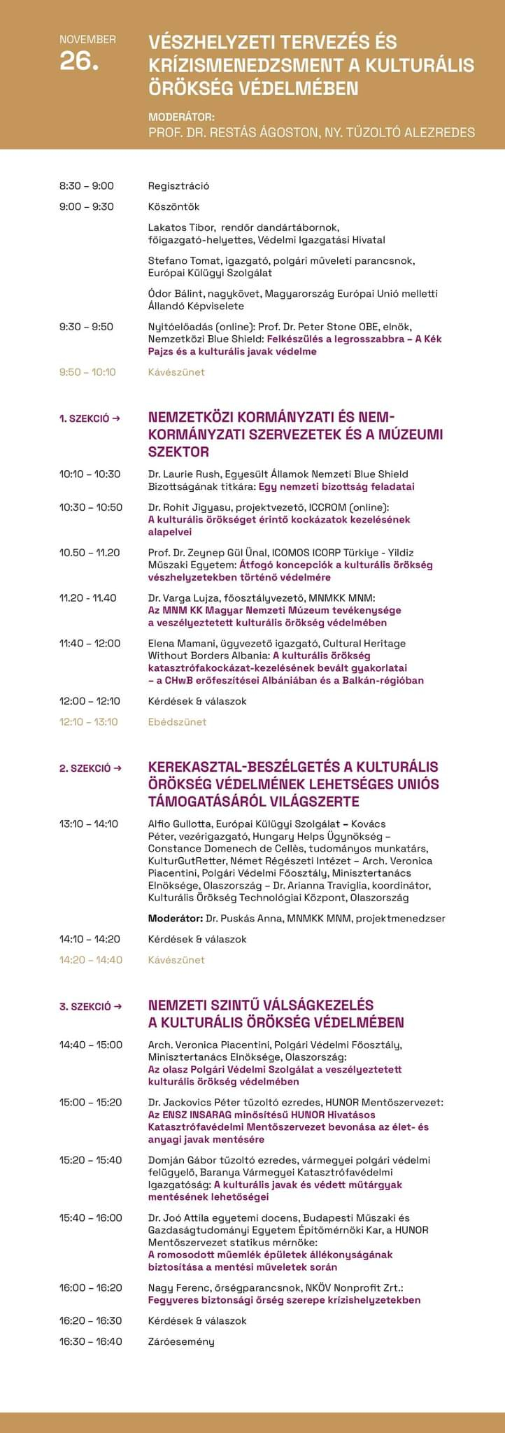 A konferencián így többek között az UNESCO, a Blue Shield, az EBESZ Heritage Crime Task Force, az Interpol, a Nemzeti Nyomozóiroda Műkincsvédelmi Alosztálya, a HUNOR, a spanyol kulturális minisztérium, az Európai Unió több projektje és még számos hazai és külföldi szakember mutatja be tevékenységét, illetve vonja le következtetéseit.