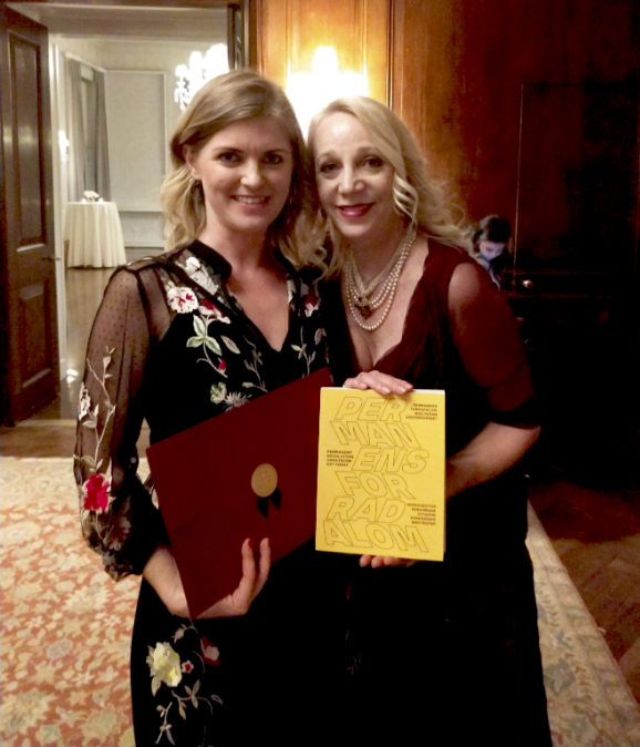 A képen Popovics Viktória, a kiállítás kurátor asszisztense látható Judy Holm, a GFAA elnök-vezérigazgatója társaságában, miután átvette a díjat tegnap New Yorkban.