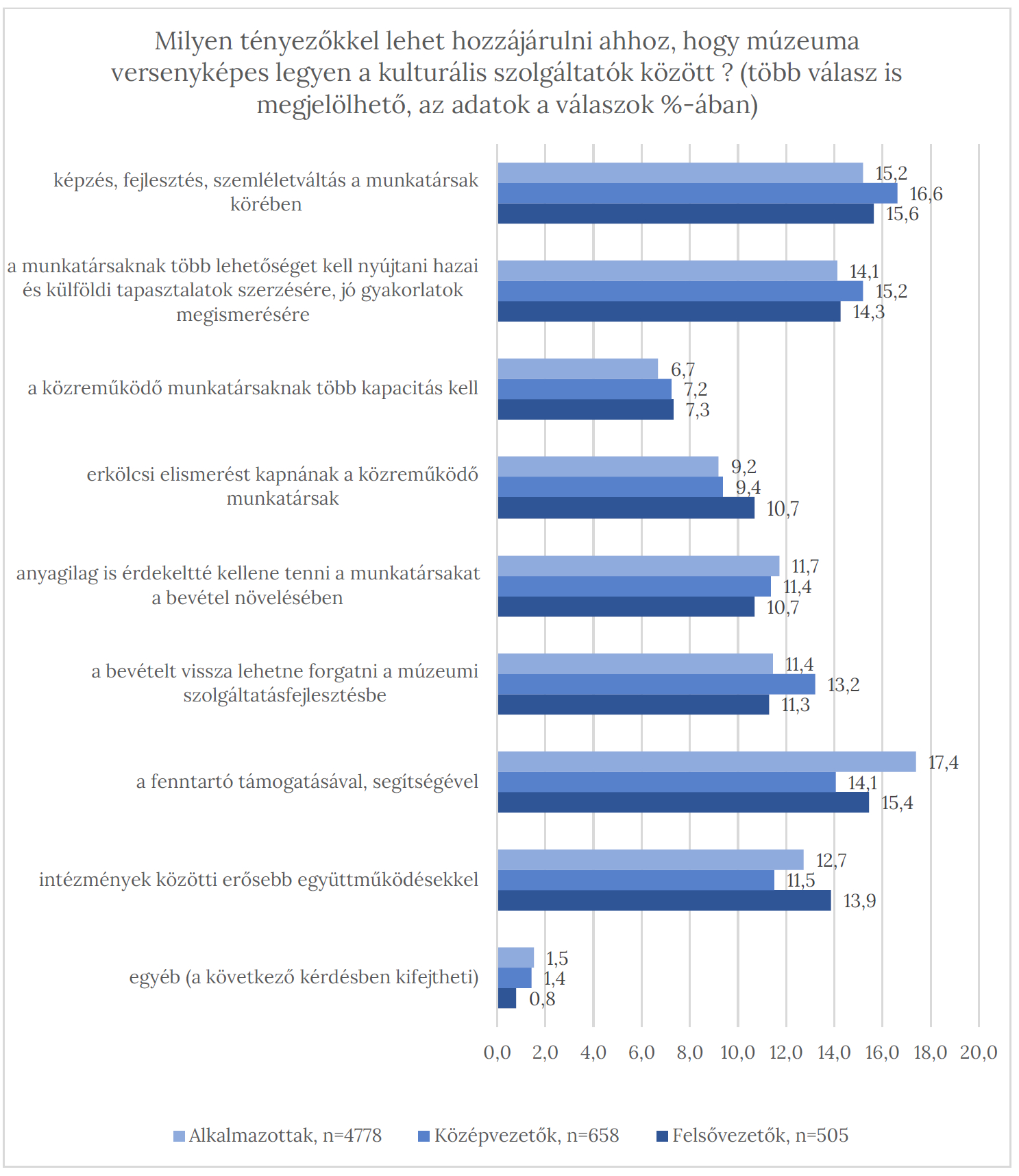 Fontos megjegyezni, hogy a munkatársak képzését, fejlesztését, szemléletváltását a felsővezetők szinte egyformán fontosnak ítélték meg, függetlenül attól, hogy milyen besorolású intézményt vezetnek. Egyedül a területi múzeumok vezetői közül adták az átlagnál kevesebben szavazatukat erre a szempontra. Ugyanakkor a hazai és külföldi tapasztalatszerzés fontosságát már ők is egyöntetűen kiemelték. A versenyképesség tényezőit vizsgáló kérdés egyéb kategóriájában 1 országos múzeum vezetője és 4 alkalmazottja véli úgy, hogy személyi átalakításokkal, rátermett kollegák alkalmazásával lehetne a múzeumok versenyképességét növelni.