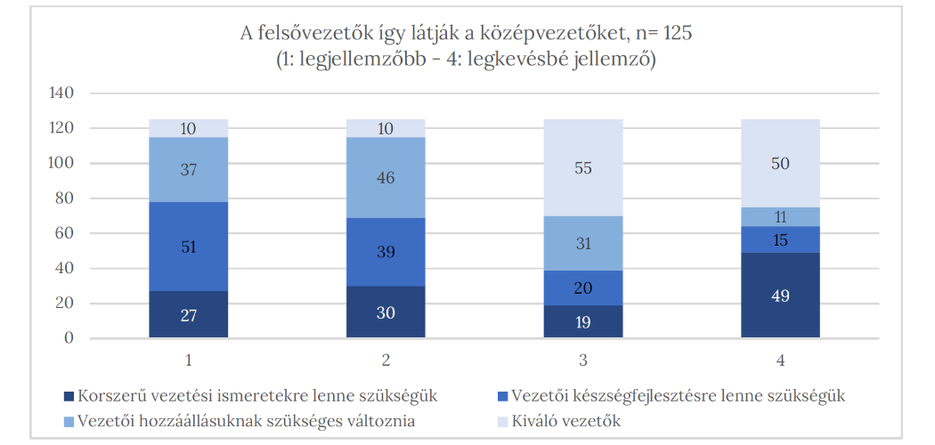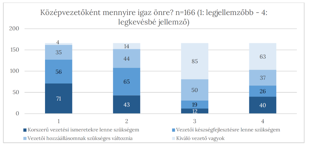 A középvezetők 43%-a (71 fő) az első, 26%-a (43 fő) pedig második helyre rangsorolta, hogy korszerű vezetési ismeretekre lenne szüksége. A vezetői készségfejlesztést 34% (56 fő) tette az első helyre, és 39% a másodikra. Kiváló vezetőnek csak kevesen (4 fő az első, 14 fő a második helyre rangsorolta ezt a képességét) érzik magukat, viszont a vezetői hozzáállása változtatását 21% (35 fő) az első helyen, 27% (44 fő) a második helyen érzi szükségesnek.