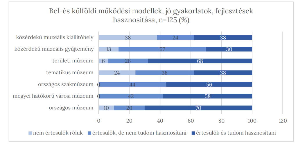 A munkatársak fejlesztési formájánál a képzések mellett a bel-és külföldi tapasztalatok, jó gyakorlatok megismerése is megjelent. 12 intézményvezető említette meg a más múzeumok jó gyakorlatainak megismerését, konferenciákon való részvétel szükségességét – közülük hatan (ebből négy országos múzeum főigazgató) kifejezetten ösztönzik a külföldi tapasztalatszerzést is. Ez a szemlélet visszaköszön az online kérdőíves felmérés adataiban is (6. ábra), mely szerint az országos múzeumok vezetői körében volt a legmagasabb azok aránya (70%), akik a bel-és külföldi működési modelleket, jó gyakorlatokat nemcsak ismerték, de hasznosítani is tudták.