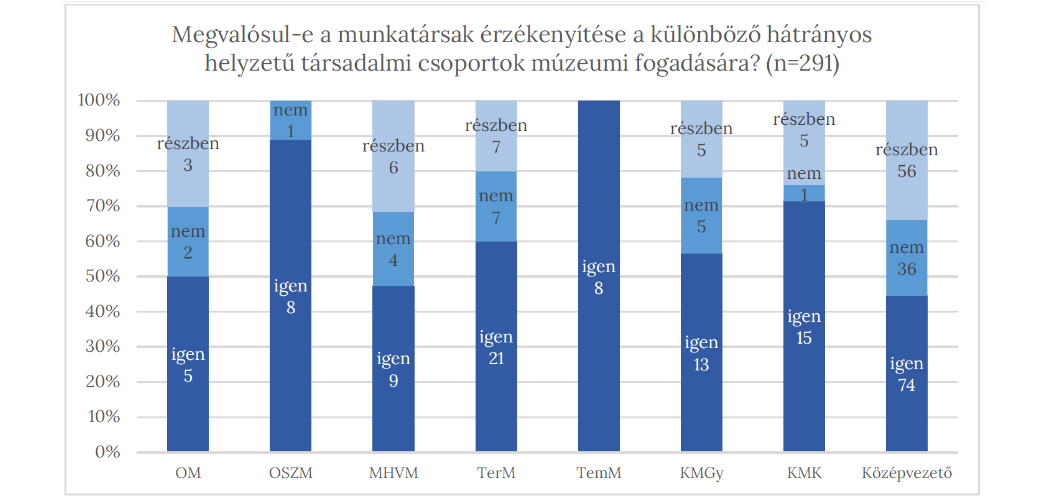 Az is vizsgálta a kérdőív, hogy miben valósul meg az érzékenyítés. A legtöbben az érintett társadalmi csoportokkal való találkozást (a felsővezetők közül 49, a középvezetők közül 44), utána a belső képzést (felsővezetők: 37, középvezetők: 31), legkevesebben a külső képzést (felsővezetők: 17, középvezetők: 24) írták be. A részben magvalósul válaszadók közül ketten megjegyezték, hogy az érzékenyítés csak alkalmi jellegű, nem tervszerű, és öten, hogy azért nincs szükség további képzésre, mert a múzeumi stáb hozzáállása megfelelő.