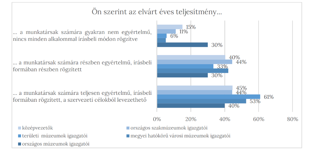 Az online felmérése rákérdezett, hogy vajon a munkatársak számára mennyire egyértelműek a teljesítményükkel szembeni elvárások. Mind a felső, mind a középvezetők többsége szerint az elvárások a munkatársak számára teljesen, vagy részben egyértelműek, írásbeli formában rögzítettek, a szervezeti célokból levezethetők (8. ábra). Ugyanakkor figyelemreméltó, hogy az országos múzeumok vezetői sokkal negatívabban látják a helyzetet, és egyharmaduk szerint a munkatársak nincsenek tisztában az elvárásokkal.