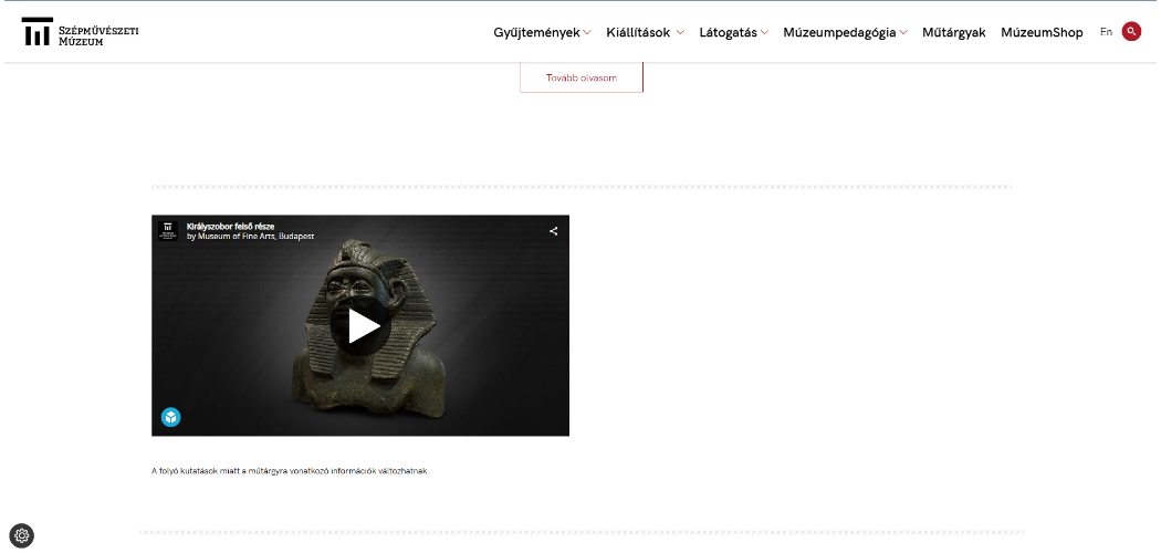 Kísérletképpen a Google keresőbe beírtam a „múzeumi műtárgyak megtekintése” kifejezést. Elsőként a Szépművészeti Múzeum honlapja került listázásra. A találatra kattintva a „Műtárgyak” aloldalra kalauzolt a Google: itt ki tudtam jelölni a „3D modellel” rádió gombot, majd rá is találtam arra a 177 műtárgyra, melyekről virtuális 3D modell készült.