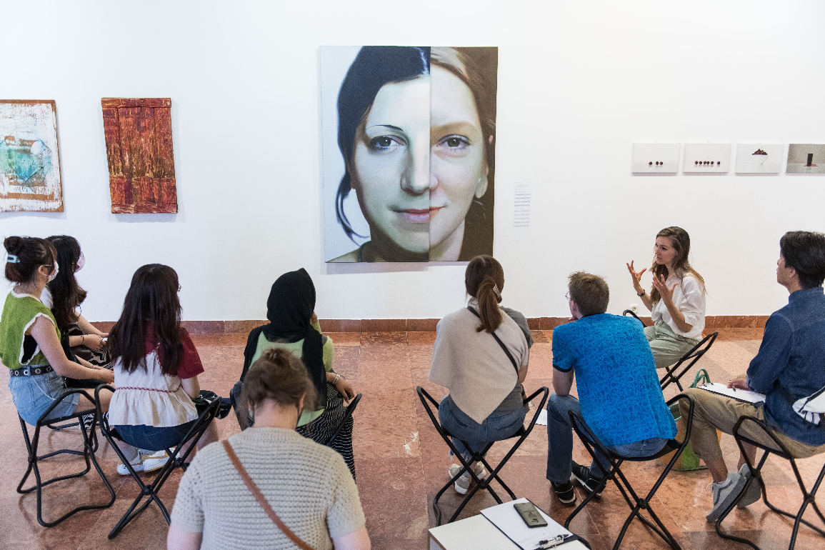 A Nemzeti Galéria programjának alapötlete egy online foglalkozásból származik, amely során a külföldi hallgatók Szinyei Merse Pál Majális című festményét ismerték meg, kifejezetten a nyelvtanulást támogató feladatok segítségével (például a festményhez illő és nem illő jelzők kiválogatása). Az óra sikere hívta életre a folytatás gondolatát. A 2021/2022-es tanévre, a múzeum újranyitását követően, egy több alkalomból álló foglalkozássorozat kidolgozása és megvalósítása mellett döntöttünk. A foglalkozások kidolgozásához nélkülözhetetlen szakmai iránymutatást és segítséget a kezdetektől Ihnatisin Írisz, a Magyar Diplomáciai Akadémia magyar mint idegen nyelv oktatója biztosítja. A kísérleti év (2021/2022) során a hallgatók hat foglalkozáson vettek részt. Négy helyszíni alkalmat két online óra egészített ki. A csoport magja egy nyolcfős osztály volt, akik két másik csoporttal, összesen tizenhét további hallgatóval együtt kezdték, majd a félév második felében kisebb csoportban folytatták a programot. Az online és élő találkozások során alkalmanként 2-3 műalkotással ismerkedtek meg. A műveket egy-egy tematikához kapcsolva ismertük meg, így például az évszakok, az otthon, az ünnep, az egyén vagy a szépség hívószavak kapcsán közelítettünk meg egy-egy alkotást. Az általános témák mellett az adott művésszel, korszakkal, stílussal is foglalkoztunk. A hallgatók munkáját előzetesen azzal segítettük, hogy a tematikához és a műalkotásokhoz kötődő szavakat, vagyis egy-egy foglalkozás szókincsét az oktató előre megkapta, egy szószedettel kiegészített óraterv formájában. Az oktató így az esetlegesen nem ismert kifejezéseket be tudta vezetni a foglalkozás előtt a hallgatóknak, akik ennek köszönhetően többnyire már ismert szókinccsel találkoztak a múzeumi órákon. A műalkotásokkal a hallott szövegértést, az olvasást, az írást, valamint a beszédkészséget fejlesztő gyakorlatok során ismerkedtek a hallgatók. A kísérleti év során szerzett tapasztalatokat beépítve a 2022/2023-as tanévben is folytattuk a programot, tizenhat fő részvételével. A módszertan továbbfejlesztése mellett további hallgatói csoportok, valamint partnerintézmények felé is nyitottunk. A Magyar Nemzeti Múzeummal 2023. április 15-én közös szakmai napot tartottunk, amelynek során bemutattuk a múzeumainkban elérhető, magyarul tanulók számára kidolgozott foglalkozásokat.