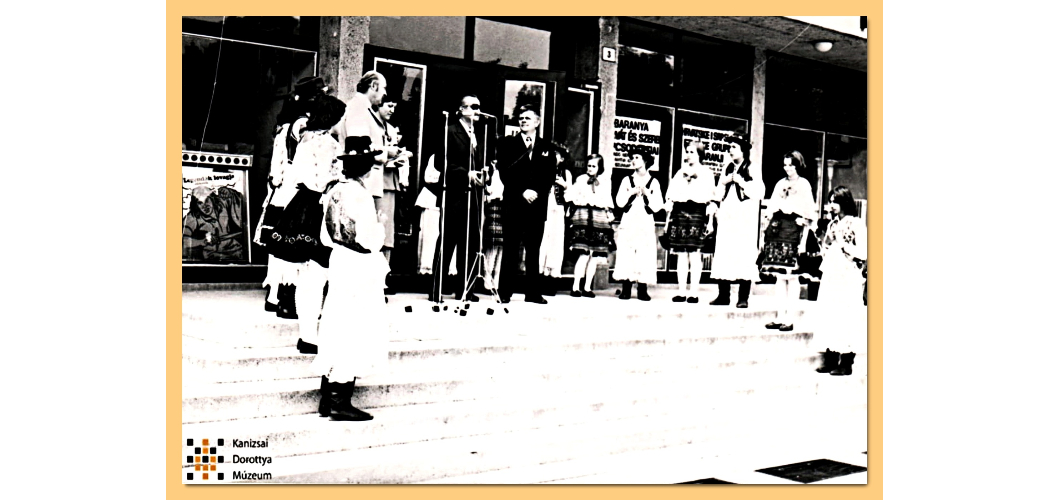 Középen, fekete öltönyben Dr. Sarosácz György, a Kanizsai Dorottya Múzeum nemzetiségi bázisintézményi besorolását megalapozó igazgatója, a „Baranya horvát és szerb csoportjai” c. kiállítás megnyitóján 1976-ban