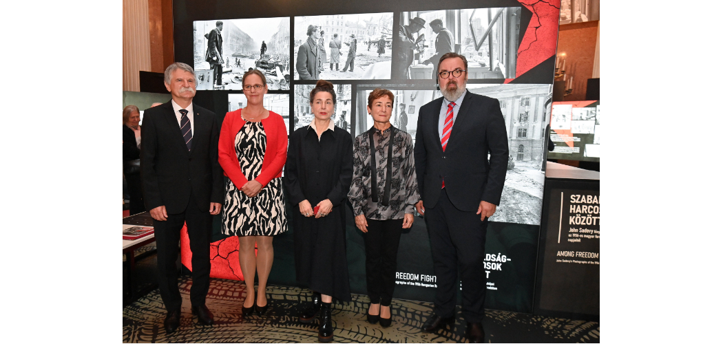Kövér László, az Országgyűlés elnöke (balról), Földváryné Kiss Réka, a Nemzeti Emlékezet Bizottsága elnöke, Liza Jane Sadovy és Yvonne Sadovy, John Sadovy lányai valamint L. Simon László, a Magyar Nemzeti Múzeum főigazgatója John Sadovy fényképei az 1956-os magyar forradalom napjaiból című kiállítás ünnepélyes megnyitóján a Magyar Nemzeti Múzeumban 2023. október 20-án.