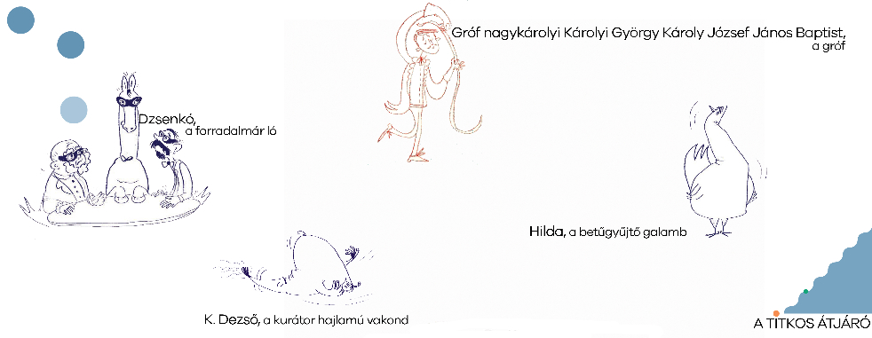 Így jöttek létre, az egyes alkalmak során modifikálódva, a múzeum egy-egy sajátosságához és adottságához kapcsolódó karakterek és meséik: a szimmetriakedvelő György gróf és Pali, a grófi palota, Hilda a betűgyűjtő galamb, K. Dezső a kurátor hajlamú vakond és Dzsenkó, a kíváncsi kiscsikó. Variálhatóságuknak köszönhetően több vagy akár minden szereplő is felbukkanhat egy-egy múzeumpedagógiai aktivitás során, a játékosok pedig lépésről lépésre ismerhetik meg birodalmaikat. Hilda, illetve K. Dezső figurájához különálló foglalkozás is tartozik.