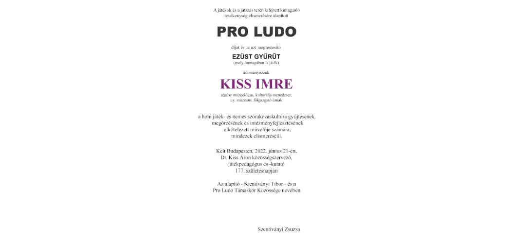 Idén Kiss Imre vehette át a tizennegyedik alkalommal kiadott Pro Ludo díjat július 19-én délelőtt a Magyar Kereskedelmi és Vendéglátóipari Múzeumban. Szentiványi Tibor (1931-2009) számítógépes mérnök, játékgyűjtő és kultúrtörténész, a Kiss Áron Magyar Játék Társaság egykori alapító elnöke 2000-ben a legendás Kiss Áron-i „Magyar gyermekjáték-gyűjtemény” újbóli kiadásának szerkesztői honoráriumából "PRO LUDO" elnevezéssel díjat alapított.