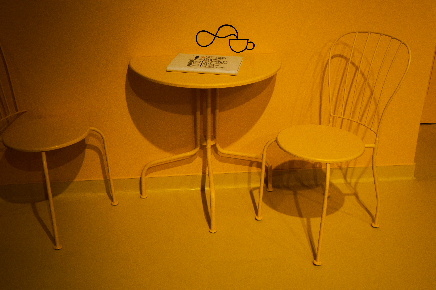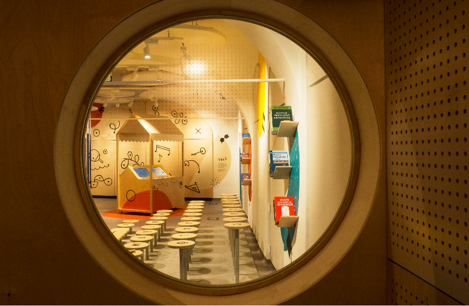 A térbe belépve szalagokon megjelenő történetindító, inspiráló szavak, témafelvetések jelennek meg, melyek segíthetik a történet elindítását. Továbbhaladva egy ún. „kukucskafalnál” tíz helyszín jelenik meg, melyek közül ki lehet választani, hol játszódjon a történet. Ehhez nem csak képi anyag áll rendelkezésre, hanem vannak helyszínek, amelyekhez különböző illatok kapcsolódnak, ezzel is segítve a gyerekeket minél inkább beleképzelhessék magukat történetük színterébe.