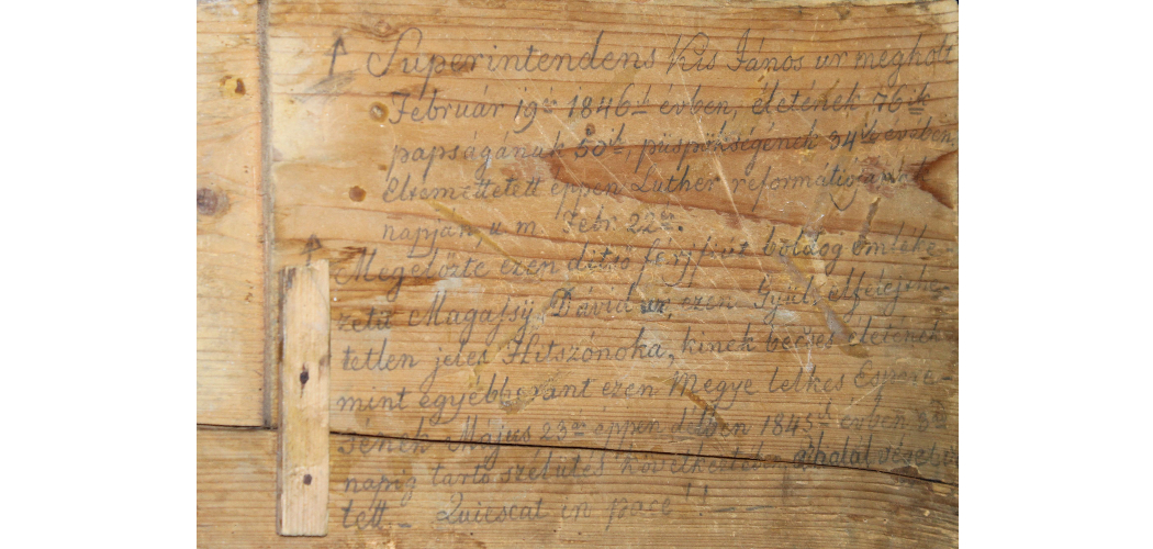 "Superintendens Kis János úr megholt Február 19-én 1846-ik évben, életének 76-ik papságának 50-ik püspökségének 34-ik évében. Eltemettetett éppen Luther reformátiojának napján u.m. Febr. 22-én.