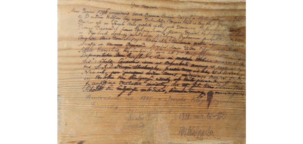 A 19. századi hangszer tavaly év végén, felajánlás révén került a Göcseji Múzeum restaurátor-műhelyébe, egy apró zalai településről, Vöcköndről, a római katolikus templomból. Amikor szétszedték a szakemberek, azzal szembesültek, hogy a burkolat belső felén feliratok láthatók. Mégpedig nemcsak szokásos bejegyzések, amelyek a hangszer felújításait hivatottak dokumentálni, hanem ennél jóval gazdagabb tartalom. A klaviatúra melletti burkolat két tábláján olvashatók a feljegyzések, a régebbi latin nyelvű, s tintával íródott. Ebből kiderül, hogy az orgonát 1796-ban készíttette a Kissomlyói Evangélikus Egyház - a hozzá tartozó filiálékkal közösen - 300 forintért. Az első orgonistáról is szólnak a sorok, aki fizetéséért gyerekeket is tanított, s az árvaház pedagógusaként szintén tevékenykedett.