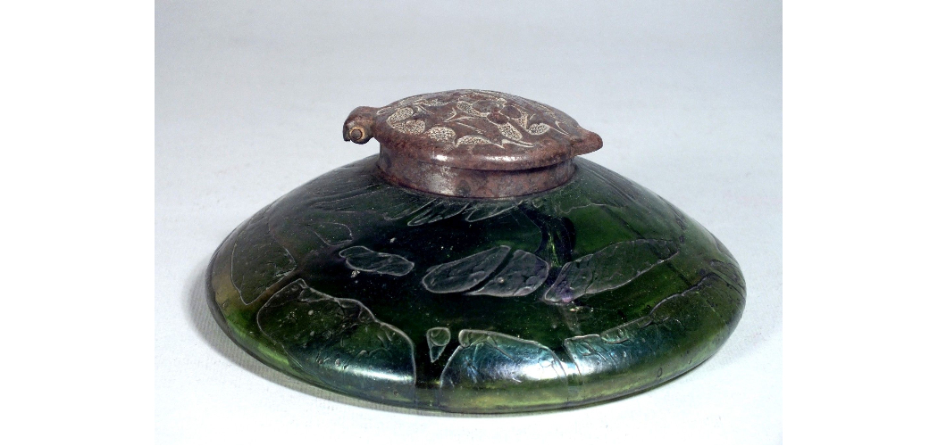Ebből az alkalomból egy online kamarakiállítást szerveztünk a közösségi oldalunkon. Hét napon át egy-egy zöld színű műtárgyat mutatunk be a közönségnek. Virtuális kiállításunk első tárgya egy TINTATARTÓ volt. Irizáló üveg, zöld alapon többrétegű, lilás-zöldes árnyalatú folyatott, amorf mintázattal. A tintatartó egyenes szájperemére zsanér mentén mozgatható, préselt vaslemeztető illeszkedik magyal mintázattal. A szecessziós stílusú tárgy az 1910-es évekből származik.