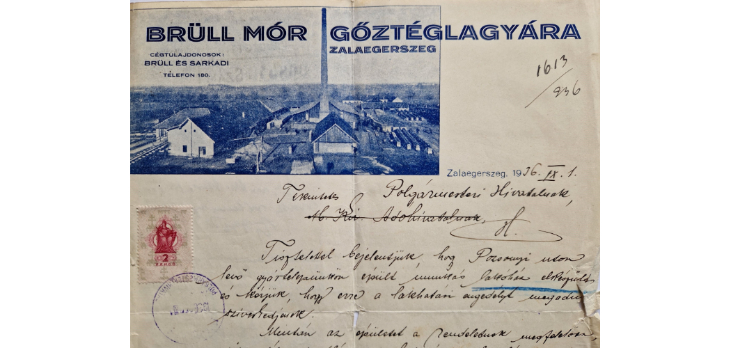 Brüll Mór volt az, aki a hősi hadifogolytemető javítási munkálataihoz 200-200 darab téglát adományozott. De a teljes bizonyosságot az a fejléces dokumentum jelentette, amelyen egy kérvényt intézett a polgármesterhez. 1937-ben a téglagyár tulajdonosa saját munkásai részére munkásházat építtetett, és ahogy azt a szabályzat előírta, a terveket először be kellett mutatni, hogy az építőbizottság elbírálja, ezután pedig a polgármester engedélyezze. A fejléces papíron pedig ugyanaz a fotográfia látható, amilyet a Göcseji Múzeum őriz. Nagy valószínűséggel Brüll Mór maga kérte fel Serényi Árpád fényképészt, hogy örökítse meg a gyárépületet.